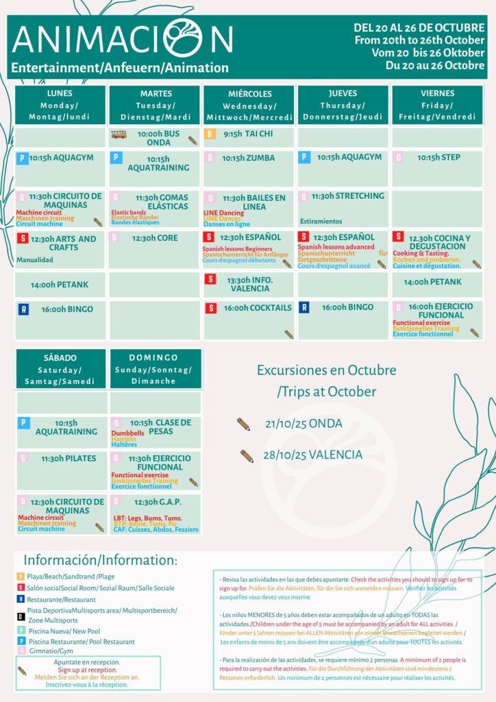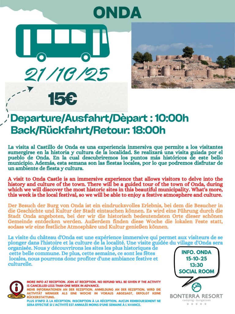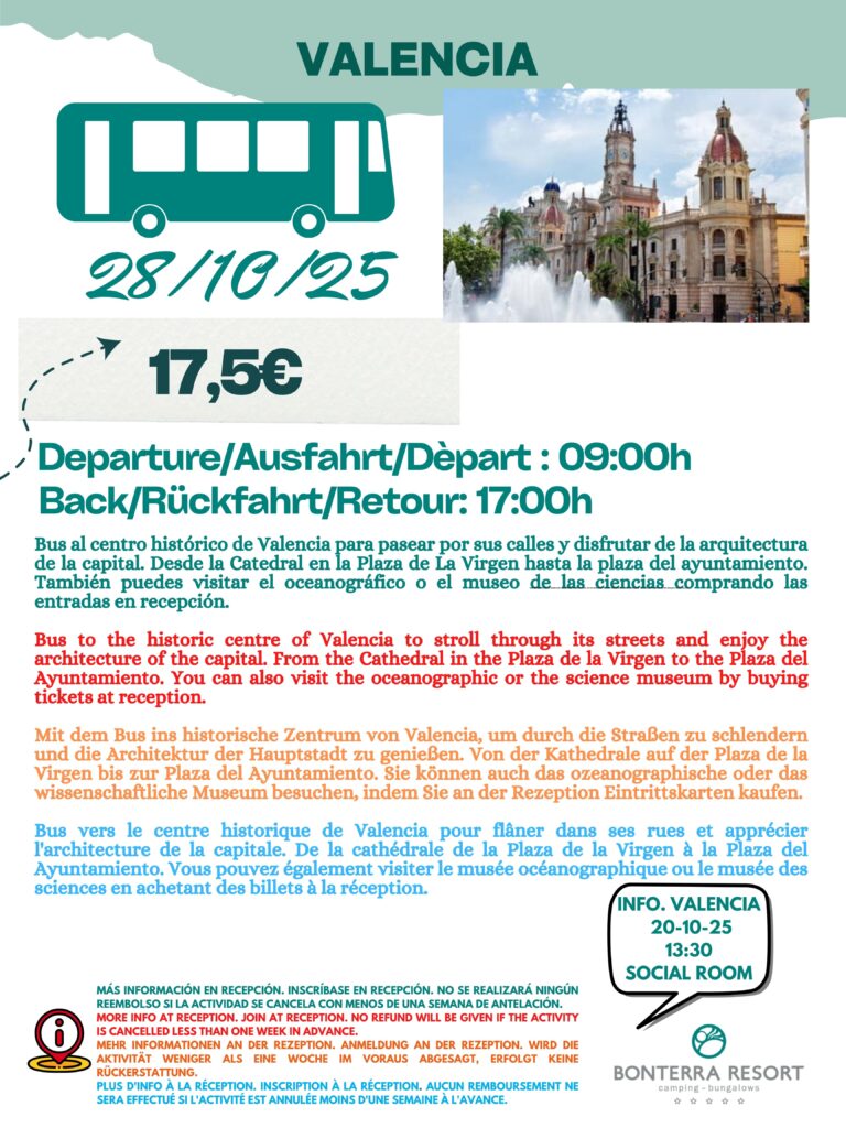 En outre, à la réception, vous pouvez vous inscrire à nos excursions à l’extérieur du camping et acheter vos billets pour: